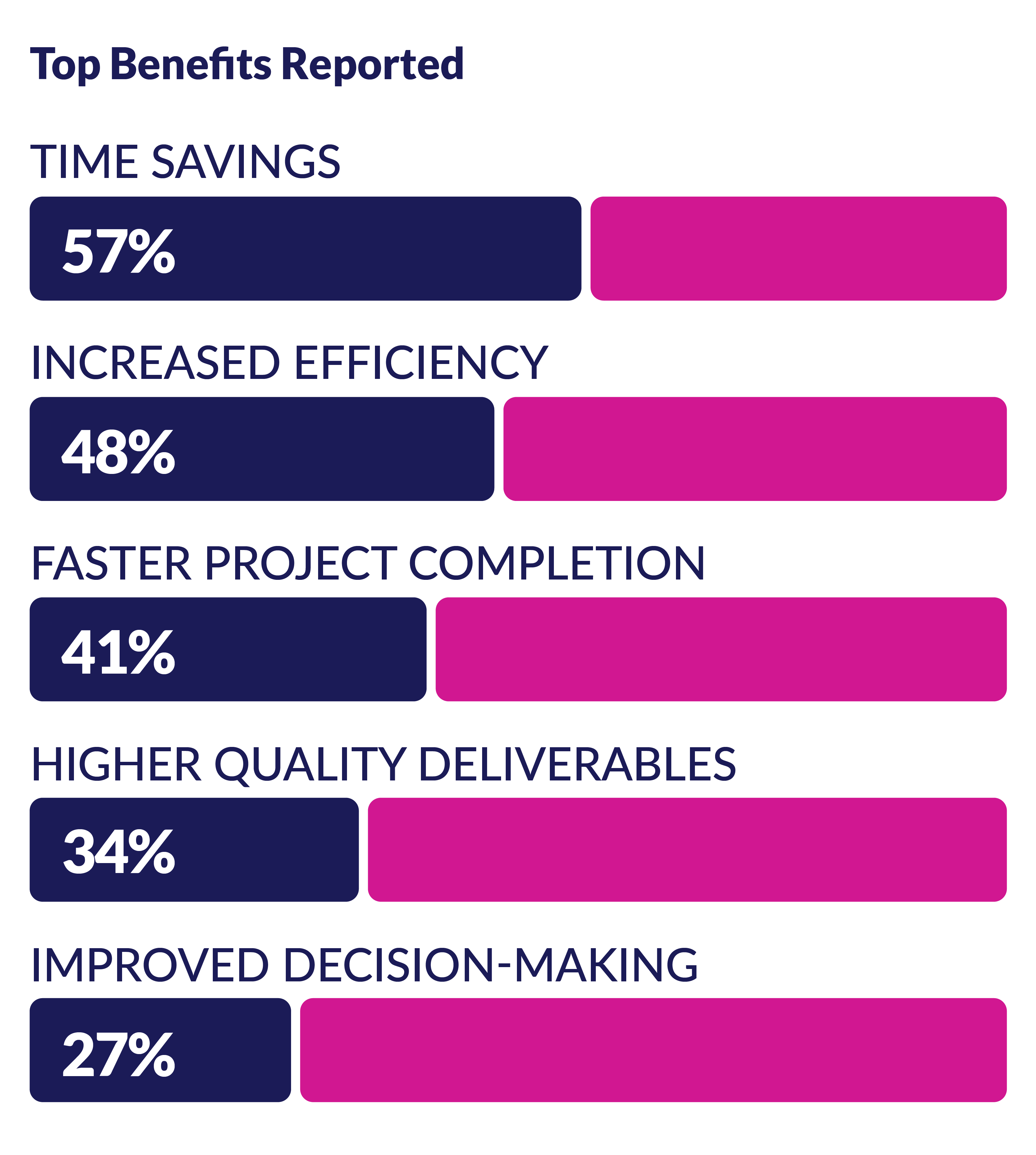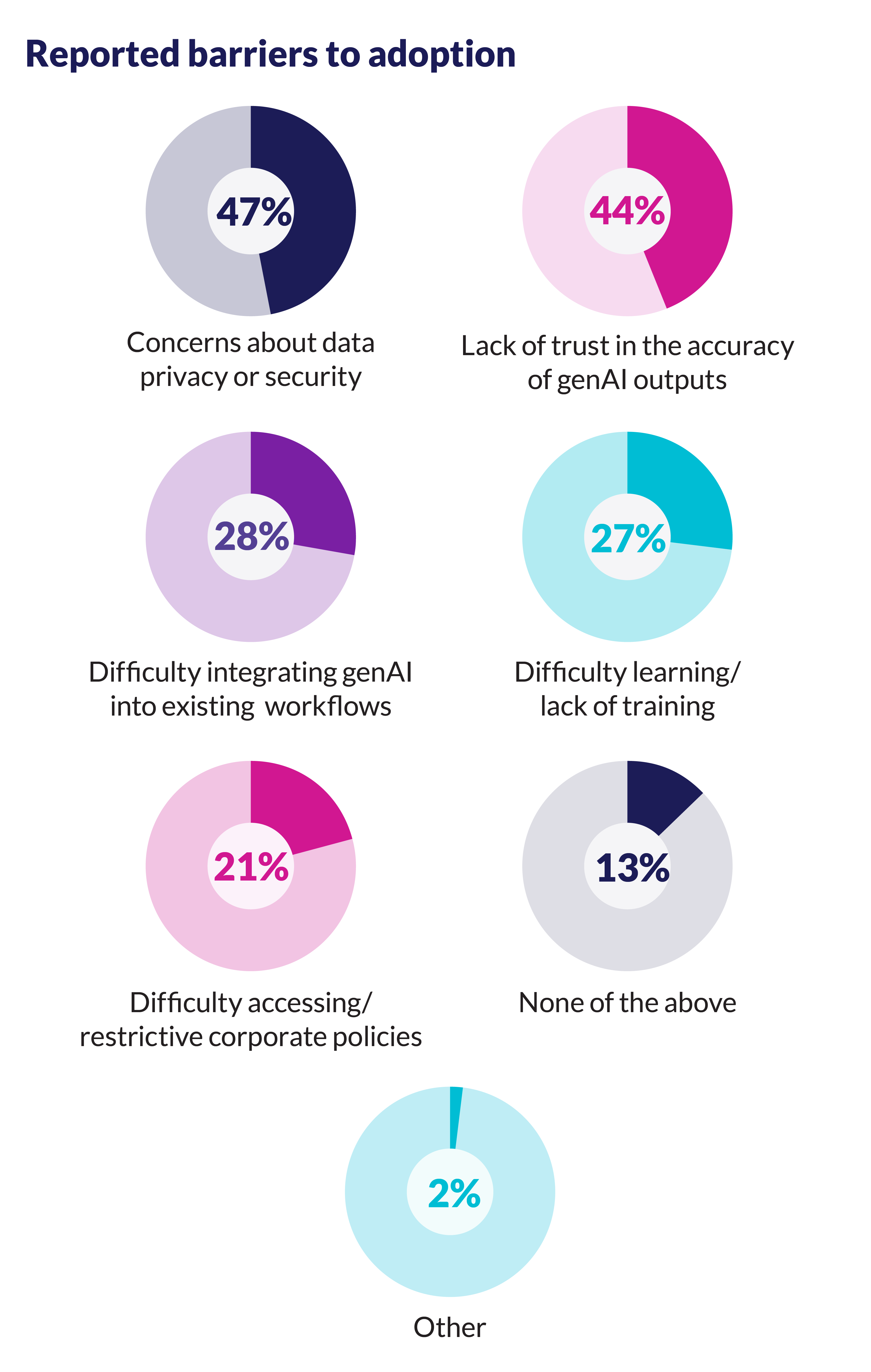 Notably, 10% of surveyed organizations have yet to adopt genAI, and others report only minimal integration. Feedback from some respondents point to barriers such as a lack of trust, insufficient training, or resistance to change, which must be addressed to unlock broader adoption.