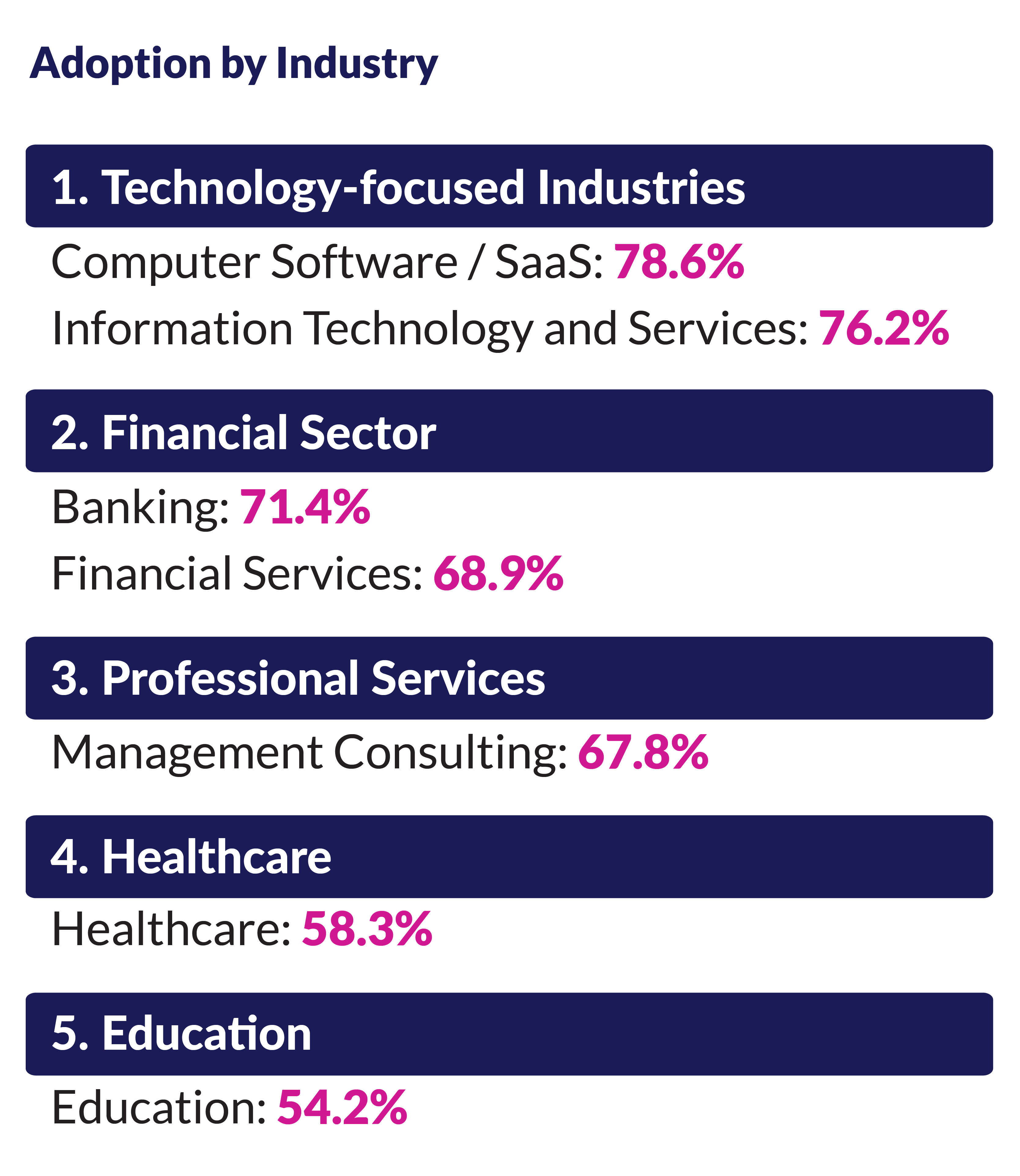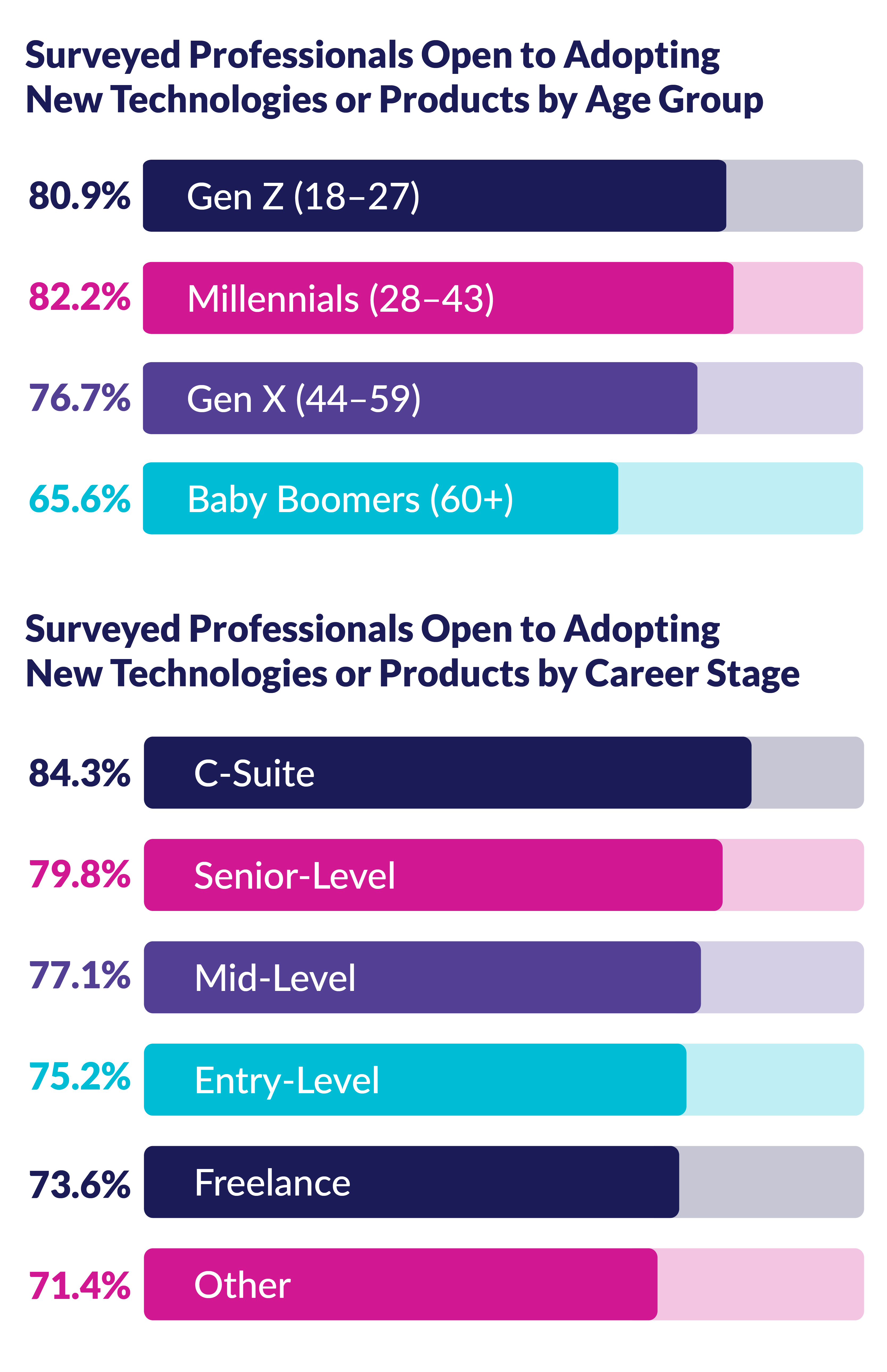 With 91% of respondents agreeing that technology is crucial to their organization’s success, the importance of tech remains significant. This year, 82% reported being open to adopting new technologies, a slight decrease from 87% last year. C-Suite leaders continue to demonstrate strong readiness, with more than half being "extremely" open to new technologies, and 84% being open overall, the highest level among all career stages, underscoring their ongoing commitment to innovation.